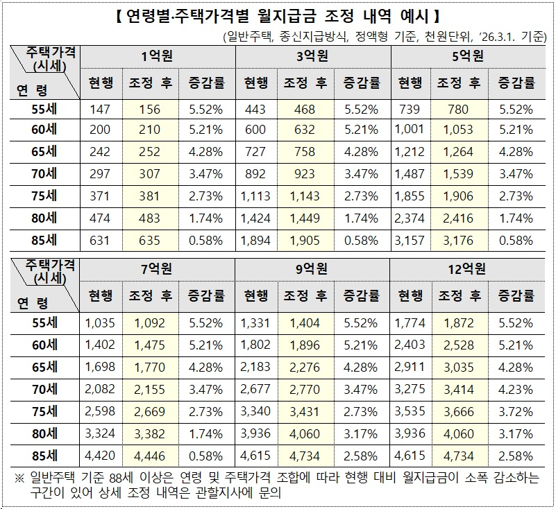 2026년 3월 1일 주택연금 신규신청자부터 주택연금 월지급금이 아래와 같이 조정됩니다.