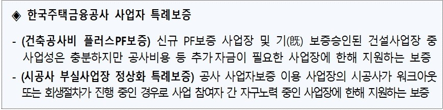 이에 따라 공사는 ▲사업자보증 보증료율 30% 인하(1년간 한시적 운영) ▲건축공사비 플러스PF보증 공급 한도 확대(2조 5,000억원→4조원) ▲사업자 특례보증의 기한 연장* 등 세 가지 지원방안을 시행한다.